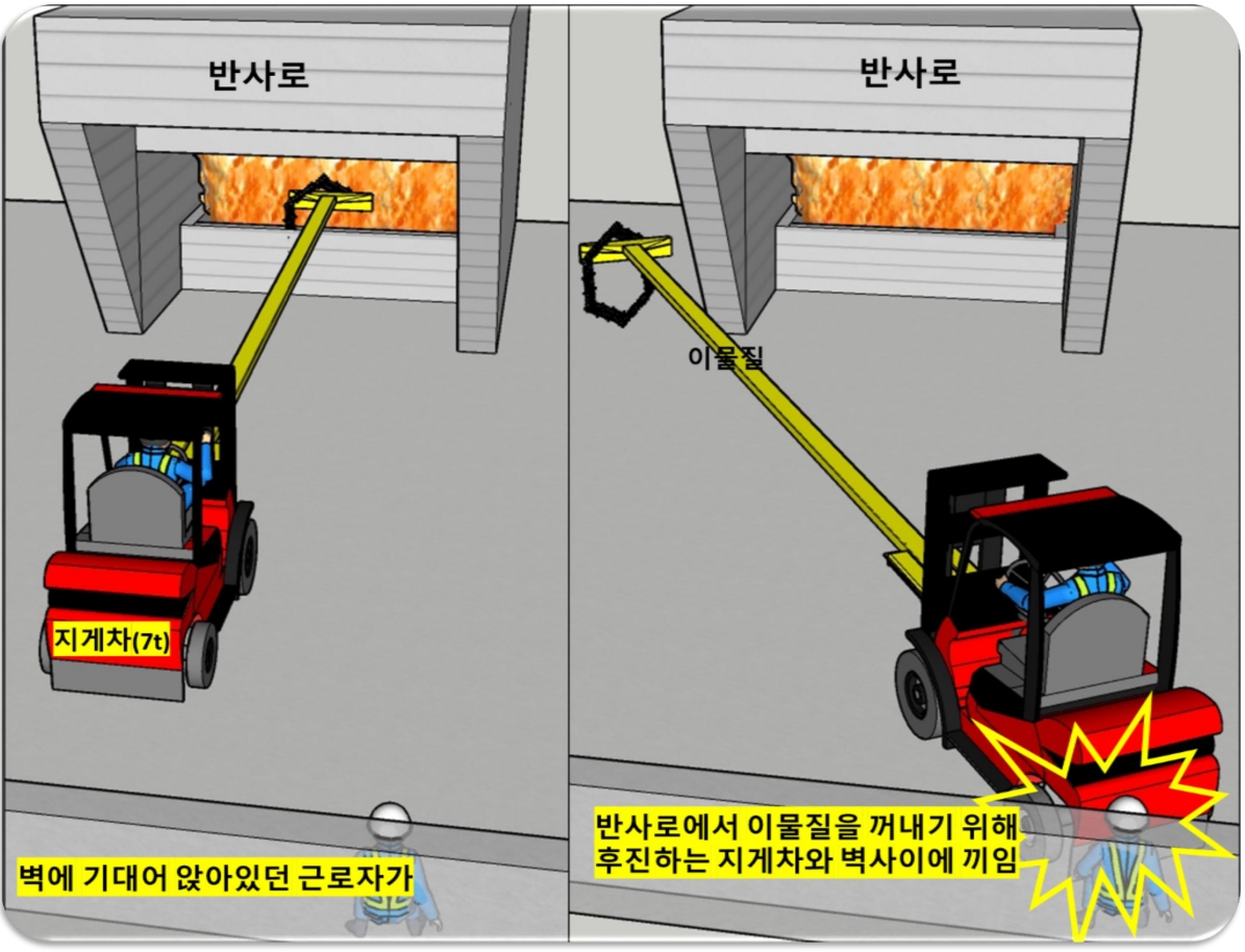 2024. 12. 00 (화) 경북 소재에서 반사로 내부의 이물질을 꺼내기 위해 후진 중이던 지게차와 벽 사이에 끼임