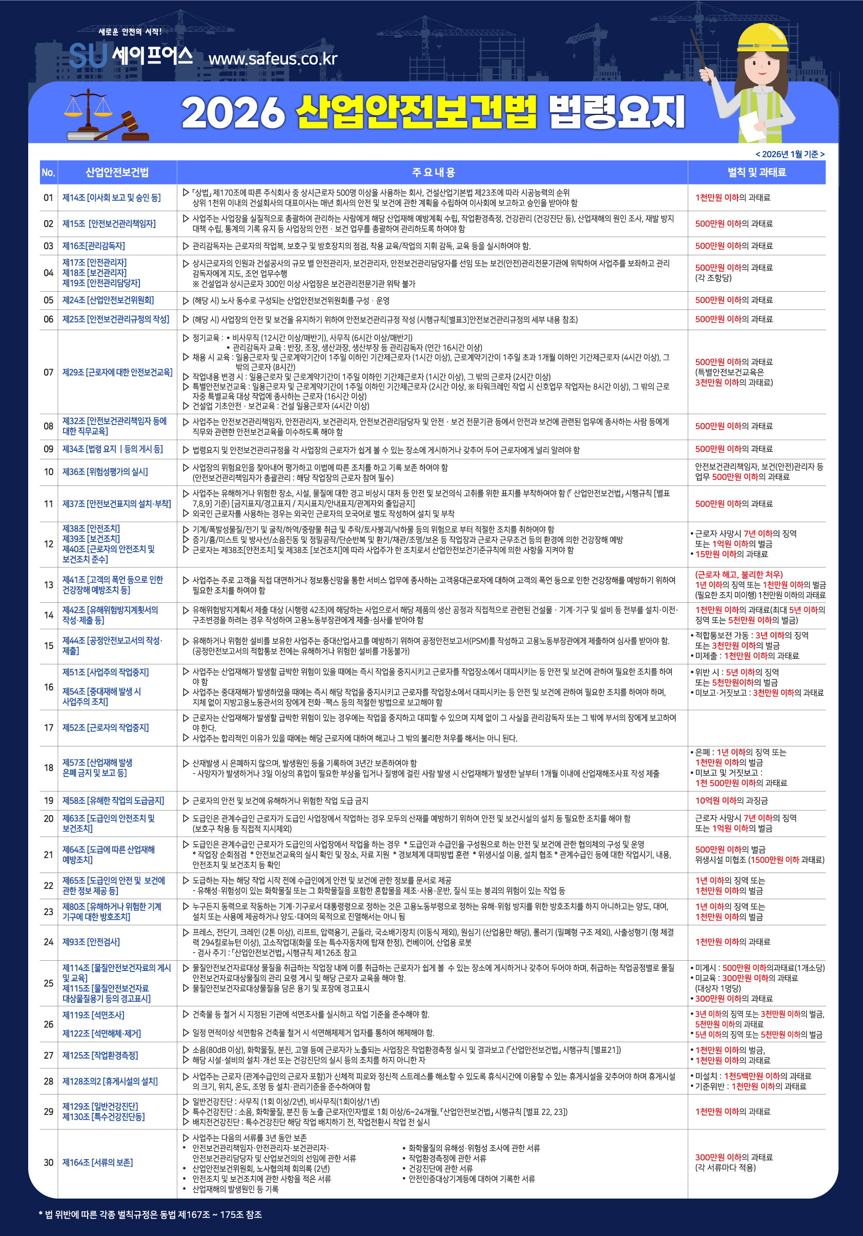 본 저작물은 '(주)세이프어스'에서 '26년' 작성한 저작물로 영리 목적으로 이용할 수 없으며, 저작물의 변경 또는 2차 저작물은 산업안전보건법 및 관계법령 등 개방된 내용에 한하여 가능하며, 출처와 게시글의 링크를 표시하는 경우 복제, 배포, 게시 등이 가능합니다.